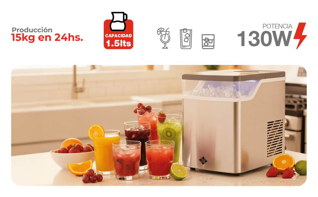 La Glacial es la solución definitiva para quienes buscan independencia y rapidez en la producción de hielo. Con un diseño compacto y una elegante terminación en acero inoxidable, esta máquina se adapta perfectamente a cualquier cocina, quincho u oficina, garantizando un suministro constante sin ocupar espacio de más.