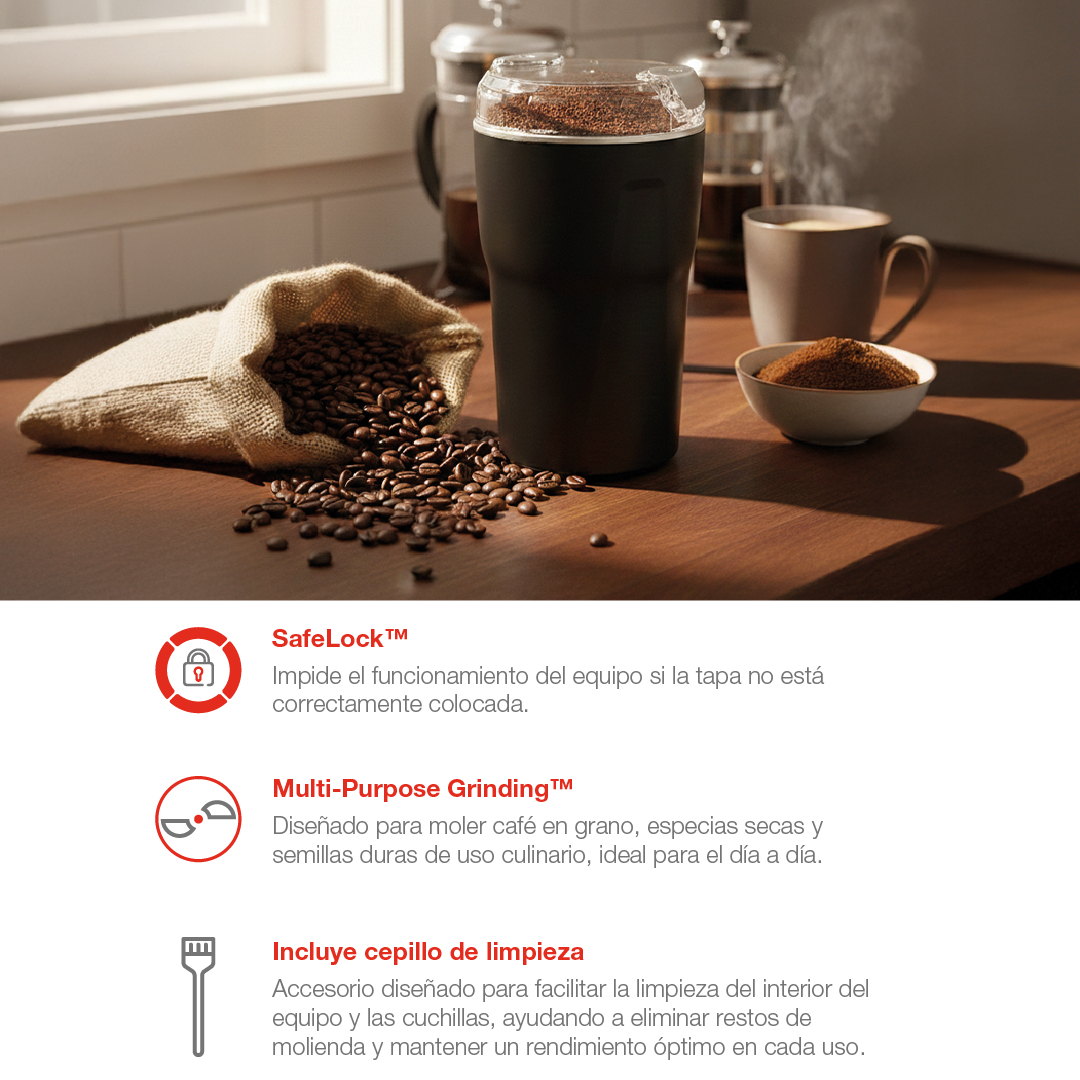 El Molinillo CG-6515 es la herramienta compacta y potente que transforma tus granos en el punto de molienda ideal. Diseñado para quienes no negocian la frescura, este equipo permite conservar el aroma natural y los aceites esenciales del café, logrando una taza muy superior a la del café pre-molido.