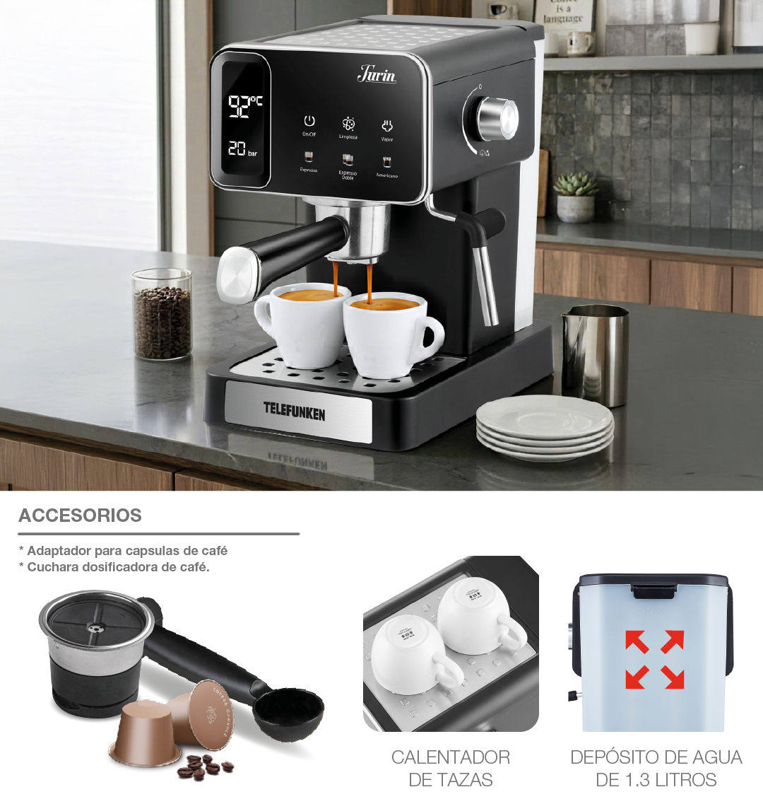 La Cafetera Turin es una máquina express de alto rendimiento diseñada para los amantes del café que buscan calidad profesional y versatilidad. Gracias a su Sistema ThermoQuick, ofrece un control de temperatura preciso y constante, garantizando que cada extracción mantenga el aroma y sabor ideal desde la primera taza.